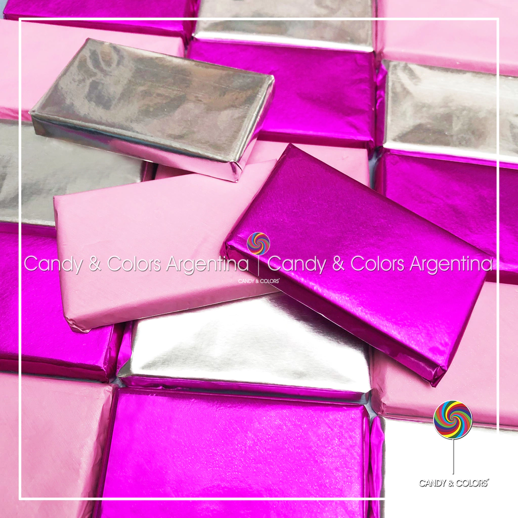 10 un. Chocolatines 6 x 3,5 cm - 8 grms - chocolate a elección - rosa fruscia y plateado