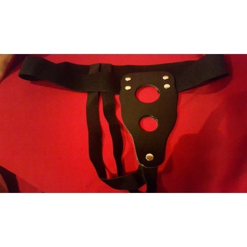 Arnés Doble Penetración Externa. Arnés reforzado de cuero, para penetración doble externa. Con elásticos para una mejor sujeción al cuerpo. Puede adaptarse a diferentes tipos de dildos, de diferentes tamaño.