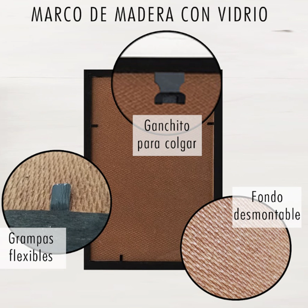 INCLUYE: Marco de Madera* ALAMO 2x1,6cm, vidrio 2mm y lámina impresa en papel ilustración 300grs. Las láminas de tamaños superiores a 30x40 se imprimen sobre material plástico (NO SE ARRUGAN NI AMARILLENTAN) . Son lavables.