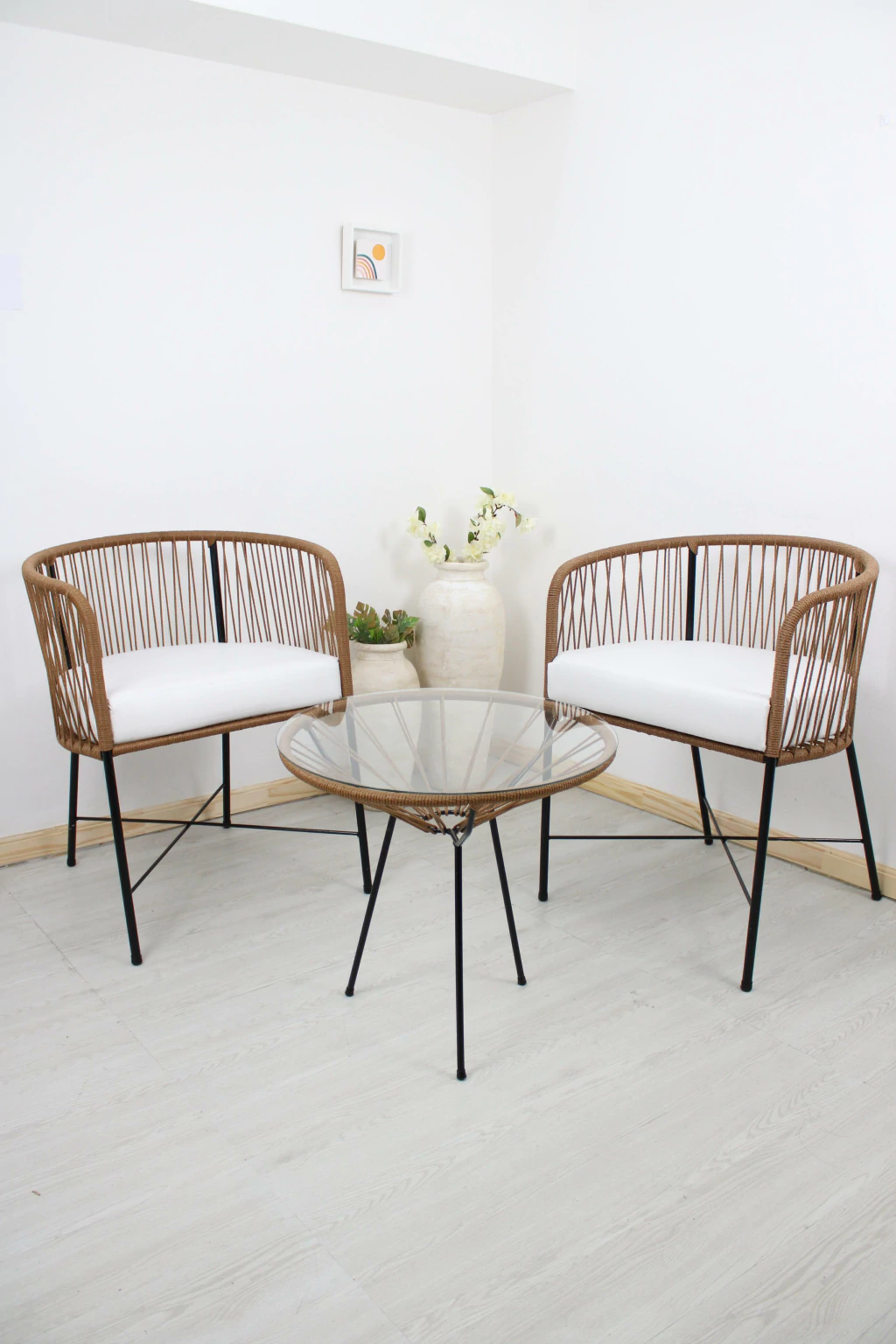 2 Sillas Roma y 1 mesa con vidrio a elección en soga símil yute