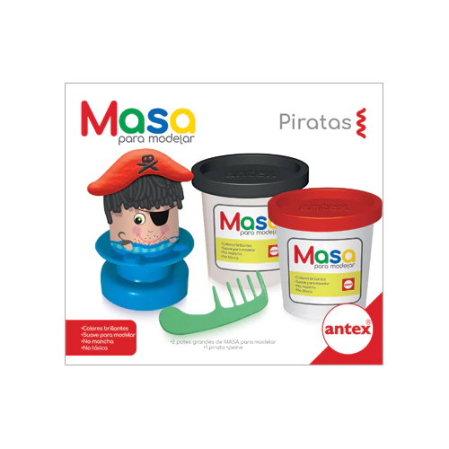 Masa Piratas 2 potes de masa, 1 personaje de Pirata y 1 peine. Artículo: 2107 Edad: +3 años Tamaño: 18.5 x 16.5x 7 cm Forma de envio: Mercado envios Forma de pago: Mercado Pago solo hacemos factura B - Consumidor Final.