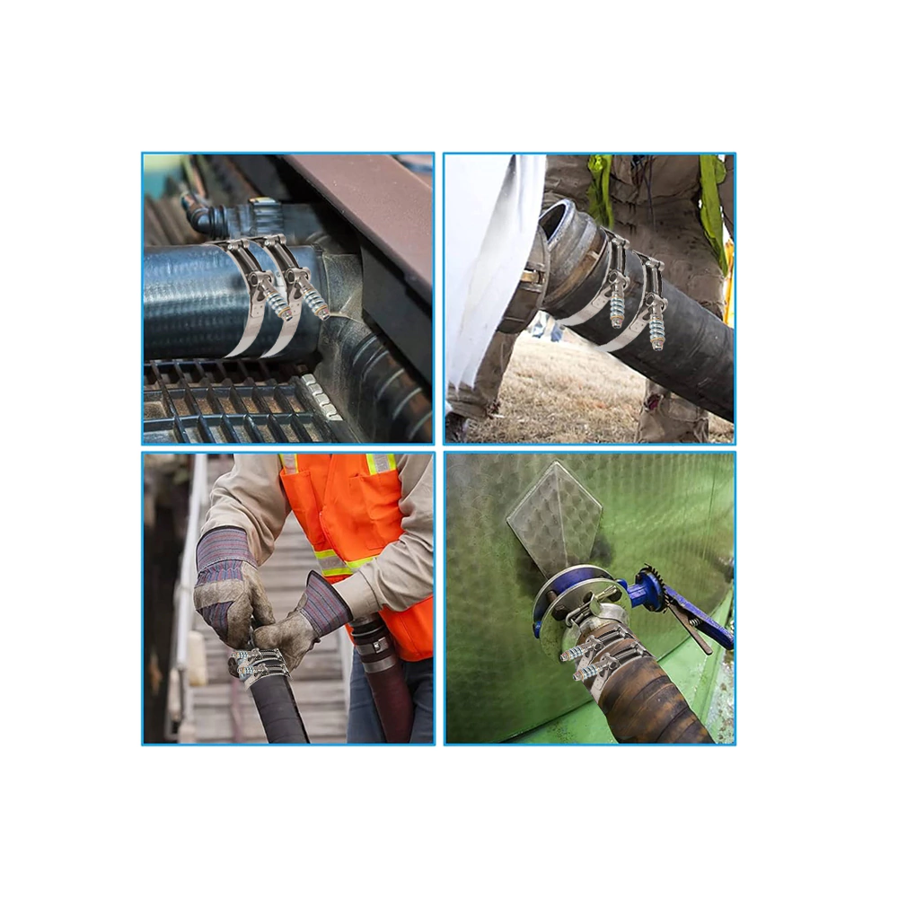 Estas características en una abrazadera completamente construida en acero inoxidable AISI 304 la convierten en ideal para su utilización en la industria química, Agro Industria, Frigorífica, Marítima, Petrolera, Alimenticia y en toda aplicación que se encuentre en contacto con agentes corrosivos.