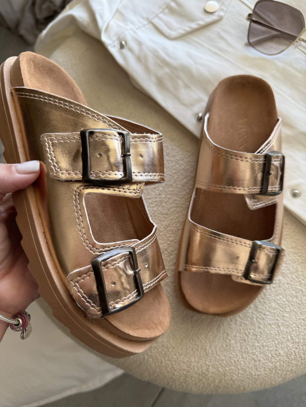 ✨ Base: Sandalias planas con hebillas.