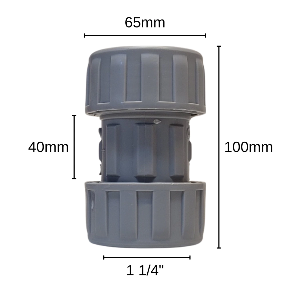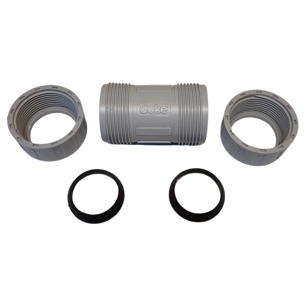Características- Marca: DUKE.- Modelo: Standard.- Acople Rápido de Compresión Standard.- Diámetro 1 1/4 pulgada - Largo 10,48 cm.- Para reparar o conectar en forma rápida y sencilla todo tipo de caños.- Cuerpo: Polipropileno.- Sello: Termoplástico.- Apto Agua Fría y Caliente 80° C.- Incluye 2 arandelas cónicas negras para Plástico.