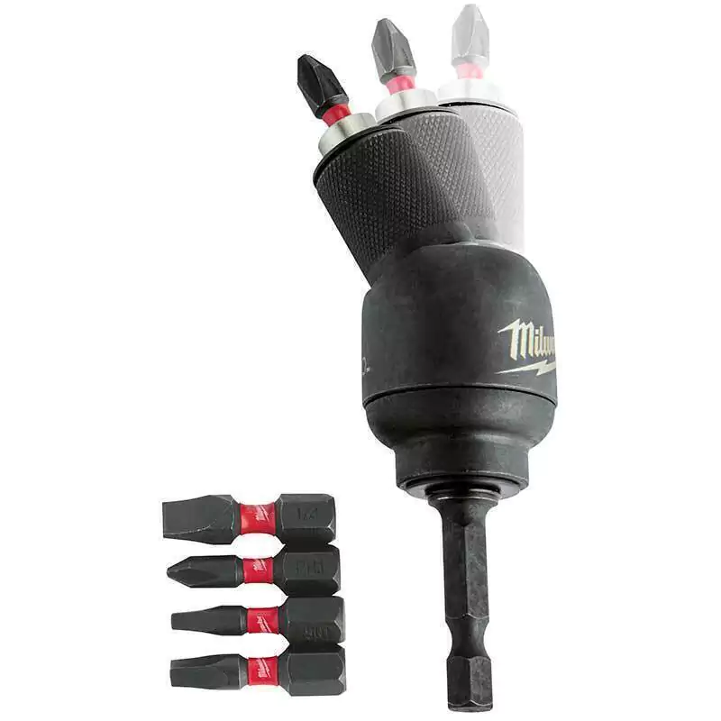 Adaptador para Puntas 30º Milwaukee + 5 puntas 4832-2300DESCRIPCIÓN:El adaptador para puntas pivotante en 30° de 6 piezas le permite colocar sujetadores y perforar orificios en áreas de trabajo estrechas y difíciles. El diseño compacto e innovador se bloquea en un ángulo de 0° o 30° y está diseñado para utilizarse con accesorios hexagonales de 1/4" de MILWAUKEE®. El juego de pivote en 30 grados de Milwaukee tiene capacidad para manejar hasta 2,000 pulg./lb de torque en destornilladores de impacto. El soporte Knuckle™ de 30° está diseñado con tecnología SHOCKWAVE™ Impact Duty™, que se fabrica para ofrecer una durabilidad extrema y una vida útil hasta 30 veces mayor. El soporte para broca magnético de Milwaukee está hecho de acero exclusivo, tratado con calor para controlar la dureza.INCLUYE:-Broca Phillips P1 de 1"-Broca Phillips P2 de 1"-Broca cuadrada SQ1 de 1"-Broca cuadrada SQ2 de 1"-Slotted Bit 1" SL 1/4"SKU: 4832-2300