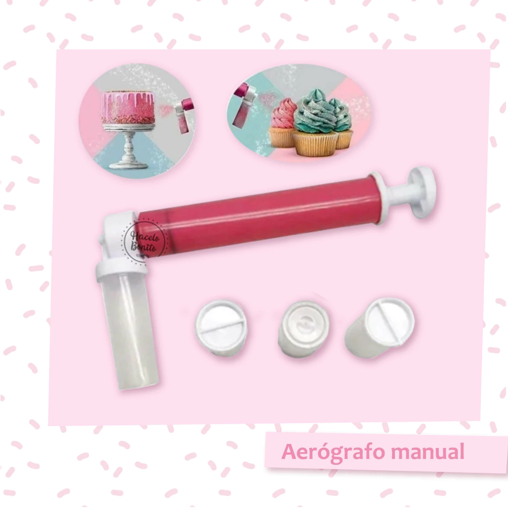 AEROGRAFO MANUAL MULTIUSO.Practico y versatil. Ideal para uso en reposteria.Contiene 4 tubos de 60 cc (viene marcado hasta 40cc pero entra un poco mas) y 1 aplicador.MATERIAL: PlasticoUSOS: colorante liquido o en polvo diluido y glitter.-Antes de usar, lubrique con algunas gotas de aceite vegetal comestible en el agujero "ACEITE", en la tapa trasera del cilindro.-Luego de cada uso, lavar con jabón neutro y aguatodas las partes y componentes.-El uso de Glitter puede bloquear el paso del aire (obstrucción).-Para evitar obstrucción lave con agua corriente después del uso.El color puede variar segun stock al momento de la compra.