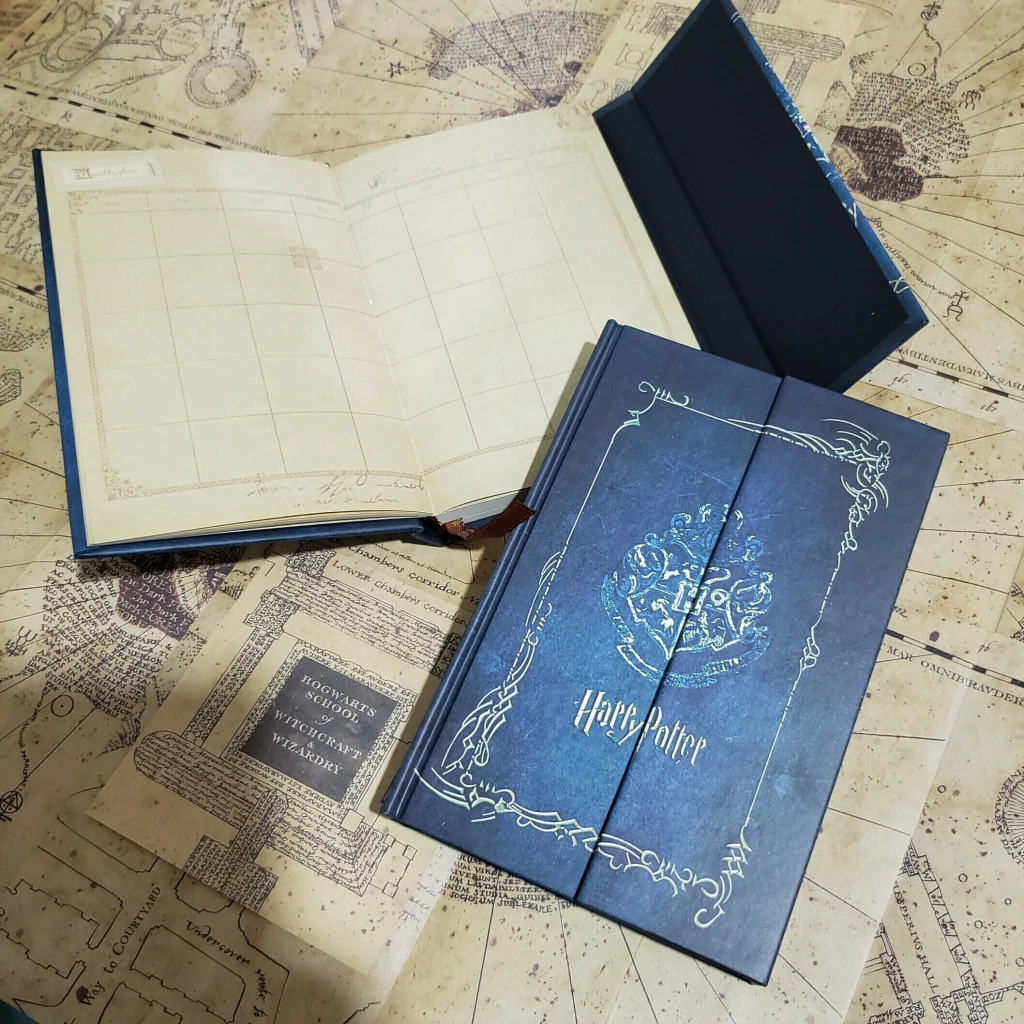 Agenda Perpetua con cierre imantadoTapa dura - tamaño 16.5 cm alto x 11 cm ancho x 2 cm profundidad aprox,El interior tieneDatos personalesHojas para planificación mensual y anualHojas para planificación semanal para 48 semanas.Hojas para anotacionesHojas intervenidas con imágenes y símbolos de Harry Potter