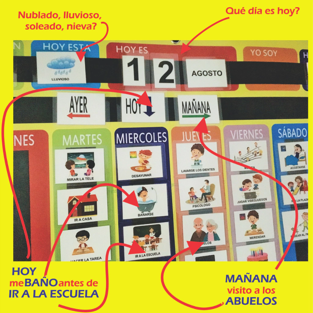 Con 72 pictogramas de actividades, rutinas y conductas y 24 pictogramas para la fecha y el mes, podrás identificar rápidamente los eventos de la semana y asi calmar la ansiedad entre otras cosas.
