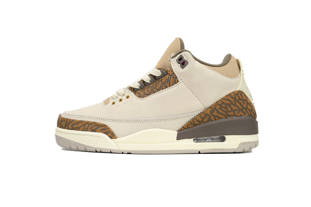 Las Air Jordan 3 Retro "Palomino" aportan a la silueta tradicional un toque rústico realzado por tonos tierra apagados. La parte superior está confeccionada en ante blanco roto con superposiciones de estampado de elefante marrón en el antepié y el talón. El diseño exclusivo se repite en la zona ocular, mientras que el nobuk perforado de color tostado se utiliza en el cuello acolchado. La clásica marca Jumpman adorna la lengüeta y la lengüeta moldeada del talón. En el talón de la entresuela de poliuretano hay una unidad Air-sole expuesta, tratada con un acabado vintage y apoyada en una duradera suela exterior de goma gris.