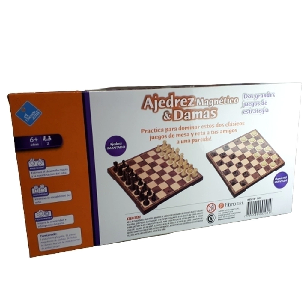 1 plataforma plegable, 32 piezas magnéticas de ajedrez, 24 fichas de damas, manual de instrucciones de ambos juegos |
