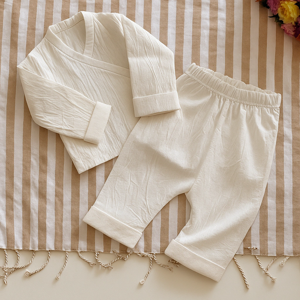 Ajuar para recién nacidos crudoUn conjunto diseñado para bebés de hasta 5 kilos, ideal para recibirlos en pleno verano. Está confeccionado en muselina, un material suave, transpirable y delicado con la piel.Incluye:•Batita cruzada con cinta: práctica para vestir al bebé con facilidad.•Pantalón sin pie: con elástico cómodo que se adapta al recién nacido.El ajuar viene presentado en una bolsita de lienzo reutilizable y perfumada, perfecta para regalar o mantenerlo guardado con cuidado. Su color neutro y su diseño simple lo hacen atemporal y fácil de combinar.Este conjunto no solo es funcional, sino que también cuida cada detalle para brindar comodidad y estilo en los primeros días de vida del bebé. ¡Ideal para las primeras fotos o como un regalo especial!