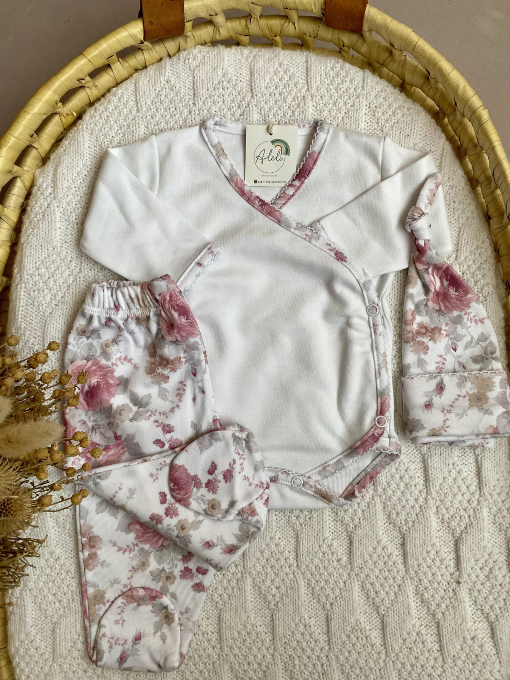 Ajuar 100% algodón pima.Contiene body oriental, ranita y gorro.Talles RN de 3 a 4,5 kilos.