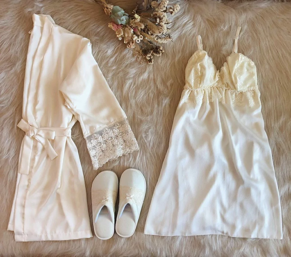 Ajuar compuesto de camisón maternal , bata y pantuflasEl camisolin maternal está confeccionado en satin y encajes variados. LLeva pieza de amamantar en jersey de algodón ribeteada .Los breteles son desmontables y tiene detalle de moño en escoteLargo 83 cm aproxLa bata está confeccionada en satin, con terminación de tul bordado en mangas, y cinto.Largo total 85 cm aproxTalle unico ( se adapta entre S y L)Las pantuflas son de jersey de algodón,con detalle de puntilla y moño