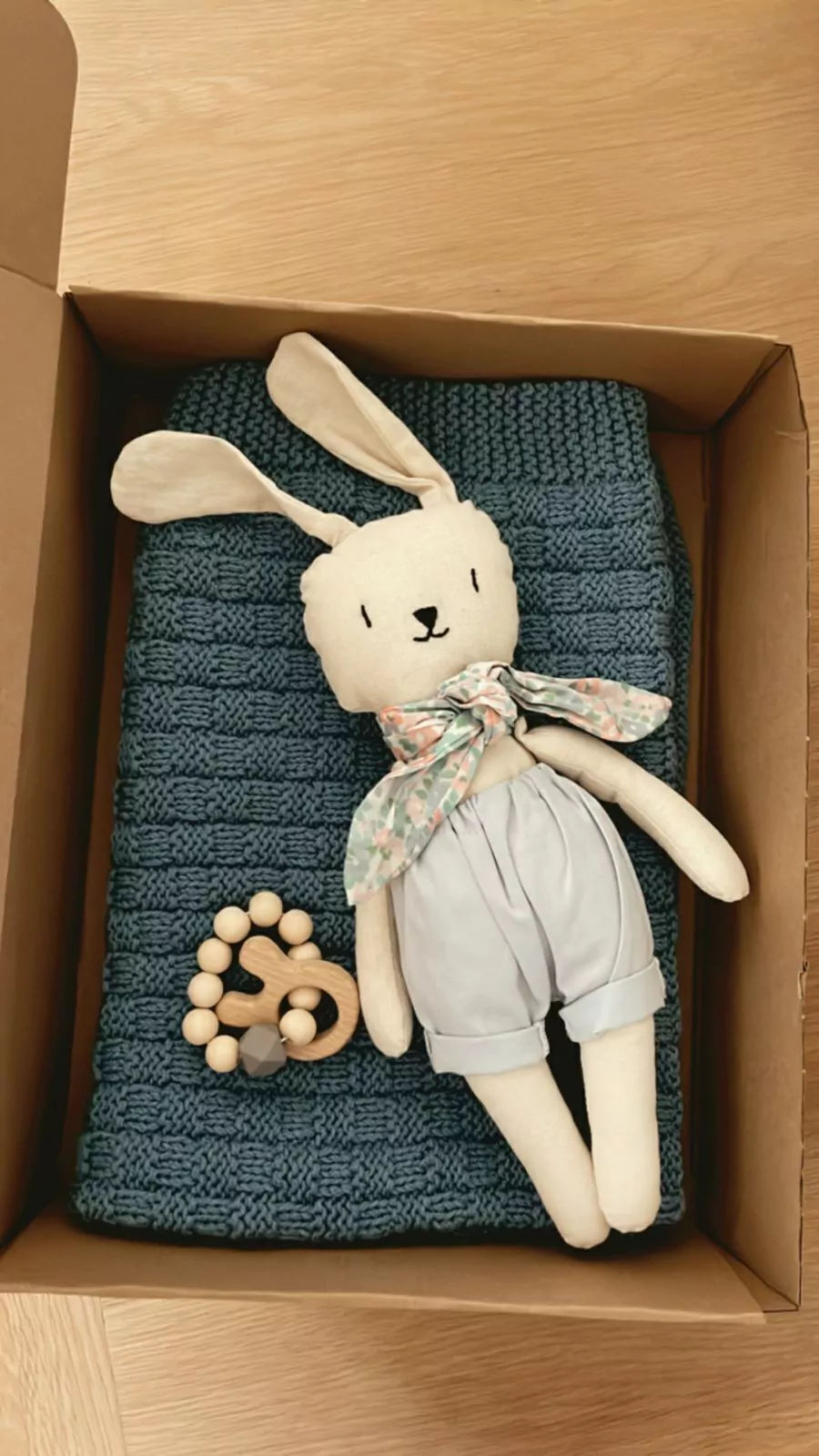 Contiene una manta tejida a mano de forma artesanal, un conejo de apego y un juguete.