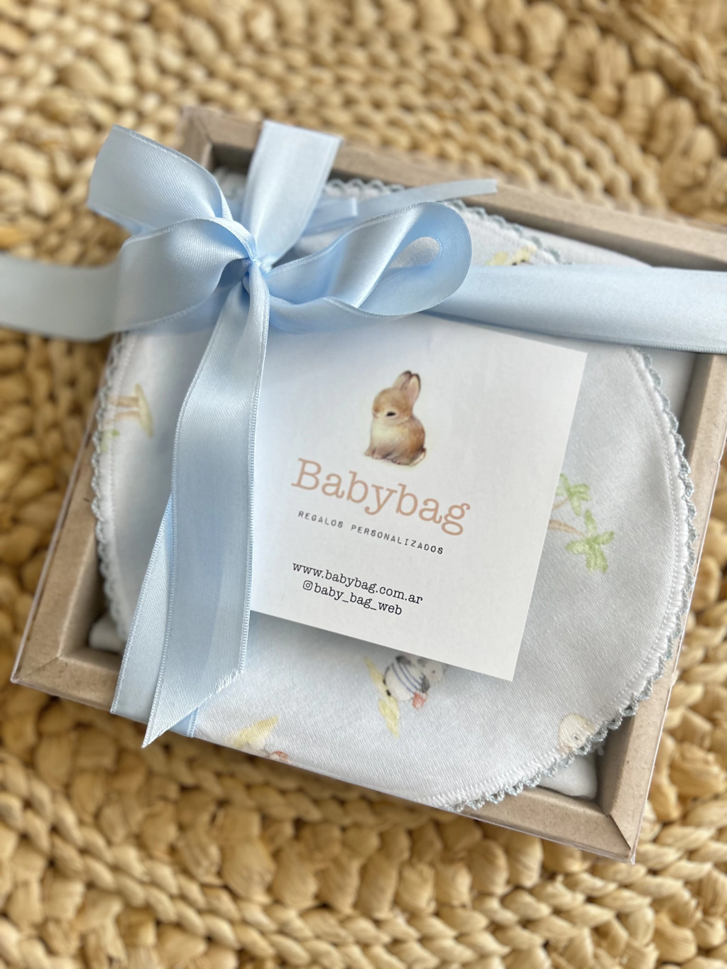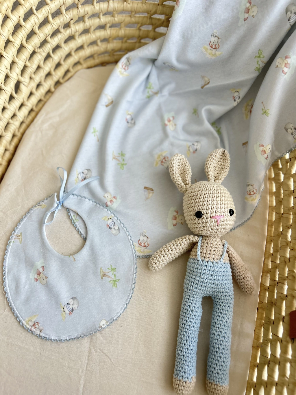 Ajuar de manta y babero en algodón pima estampado.Regalo de nacimento,Bienvenida del bebe.