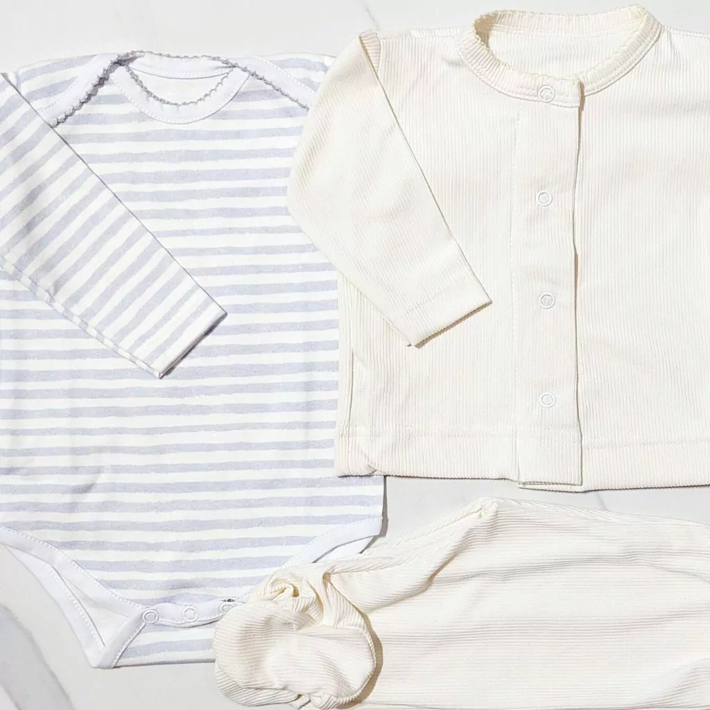 Ideal para regalar a un Recién Nacido!Diseño Unisex.Este precioso set incluye saquito y ranita en un micro morley super suave y body en algodón pima blanco a rayas grises con terminación en picot.Delicado y suave para la piel de tu bebé :)Presentado en nuestros papeles de seda estampados, listo para regalar!Talle 1 de 3,5 kg a 6 kg aprox