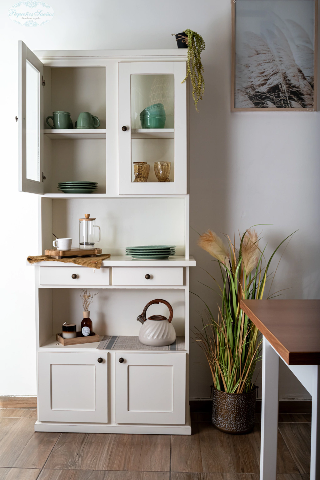 La Alacena Fátima incluye dos módulos, uno superior que cuenta con un estante y dos puertas con vidrio, y uno inferior, que presenta una mesada, dos cajones, un estante y dos puertas ciegas con interior para almacenamiento. Es ideal para una cocina o cocina comedor. Los vidrio están incluidos salvo para entregas de larga distancia.