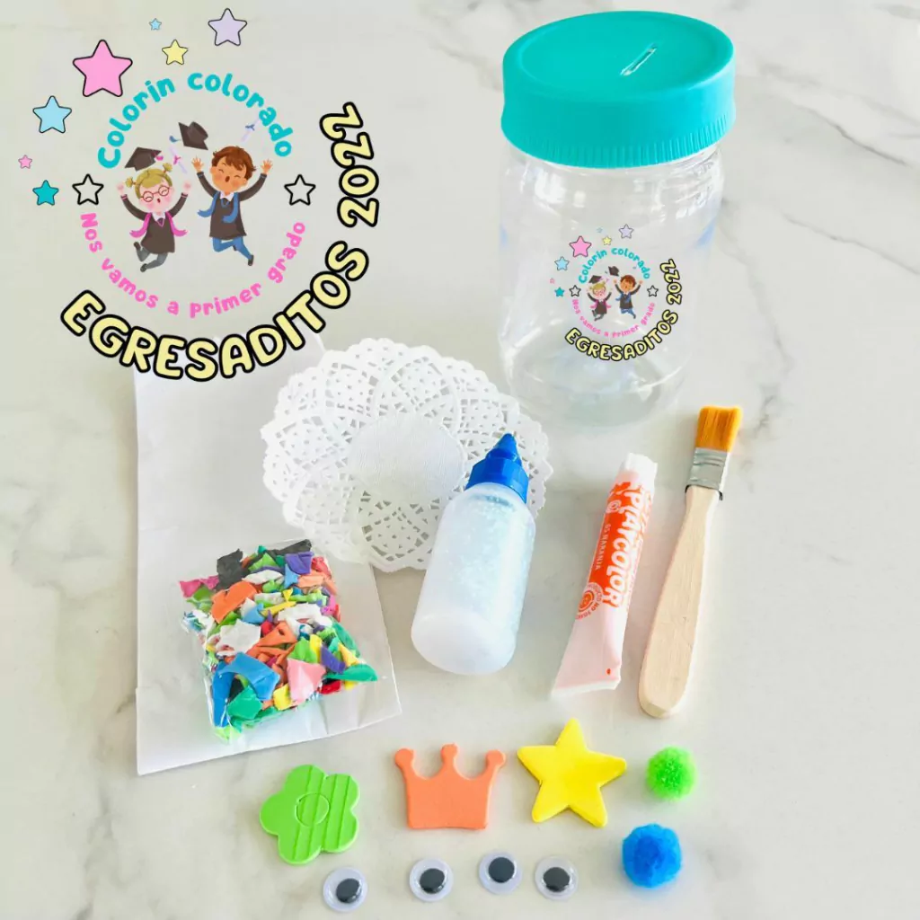 Mini potes alcanciacolores surtidos:incluyen:1 tempera1 pinceleta1 adhesivo2 blondas1 sobre1 goma eva picada3 formitas de goma eva4 ojitos2 pompones