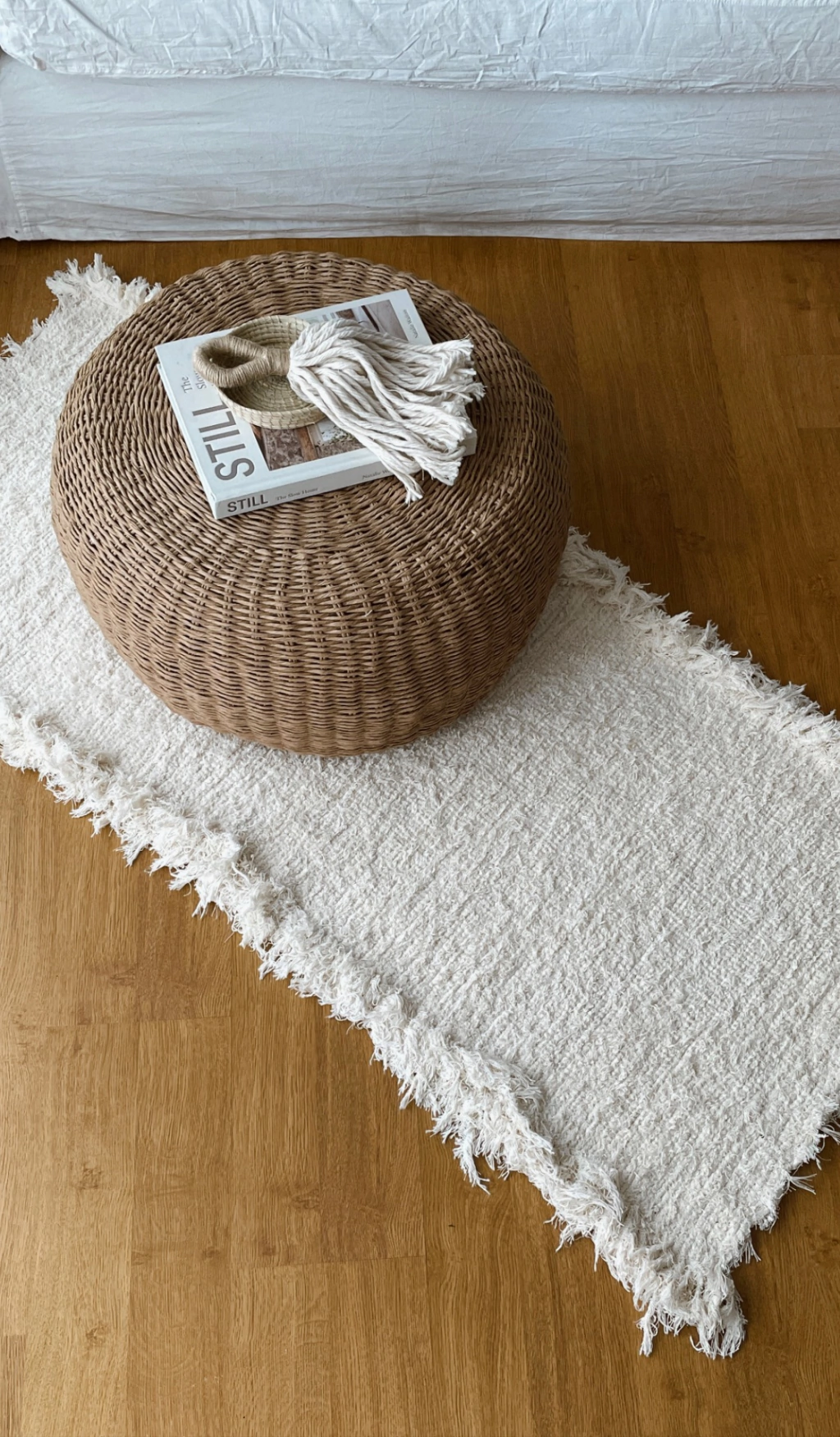 Alfombra tejida en telar en hilo de algodón. Tonalidad natural. Apta lavarropas y secarropas.
