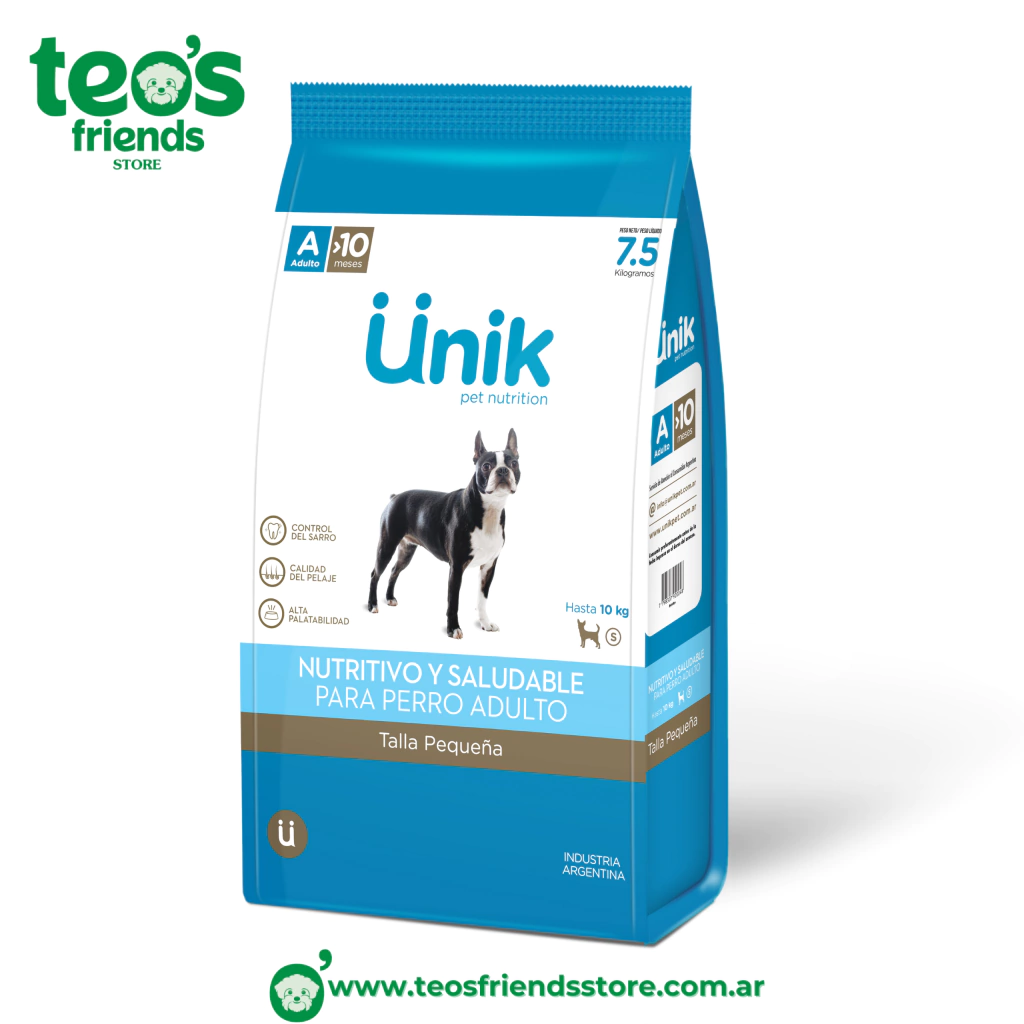 Todos nuestros alimentos tienen vencimiento de 6 meses a 1 año desde la fecha de compra.—---------------------------------------------------------------------------------------------------------------------Comprá antes de las 14 y obtené el envío en el día—---------------------------------------------------------------------------------------------------------------------Agregá varios productos a tu carrito para pagar un sólo envío. ¡Si superas el monto mínimo el envío es GRATIS!—----------------------------------------------------------------------------------------------------------------------Indicado para perros de talla pequeña (hasta 10 kg). A partir de los 10 meses de edad.Ünik Pet, alimento nutritivo y saludable para perros adultos de talla pequeña.Ünik Pet Perro Adulto Talla Pequeña, cubre las necesidades del perro de talla pequeña a partir de los 10 meses manteniendo su peso ideal, garantizando una buena palatabilidad y salud en general. Incluye: gran concentración de todos los nutrientes esenciales, alta digestibilidad, densidad energética controlada para evitar el sobrepeso, incorporación de antioxidantes, cuidado de la salud dental y del tracto digestivo.CaracterísticasControl de Sarro:El Zinc evita la acumulación de sarro y ayuda a proteger el esmalte de los dientes.Calidad del Pelaje:Contribuye a mantener el buen estado de la piel y el pelo, gracias al aporte de nutrientes específicos y alto contenido de Omega 3 .Alta Palatabilidad:Los perros de talla pequeña tienen un apetito caprichoso. Gracias a sus aromas e ingredientes seleccionados y a las técnicas de procesamiento utilizadas, Ünik garantiza la satisfacción del apetito caprichoso. También promueve el mantenimiento de un peso saludable en perros de talla pequeña, gracias al aporte controlado de energía- EM: 3912 Kcal/Kg—----------------------------------------------------------------------------------------------------------------------Teo’s Friends es un PetShop online importador de productos de primera calidad para mascotas.Contamos con una amplia variedad de productos, accesorios, mochilas, bolsos y juguetes.Nuestro objetivo es dar soluciones para mejorar la vida de tu mascota.Nos gusta poder llevar a nuestras mascotas en todas nuestras aventuras y por eso nos especializamos en soluciones para viajes y paseos.Revisá todos los productos de nuestro catálogo.Consúltanos por cualquiera de nuestros productos y responderemos a la brevedad.—---------------------------------------------------------------------------------------------------------------------Agregá varios productos a tu carrito para pagar un sólo envío. ¡Si superas el monto mínimo el envío es GRATIS!—---------------------------------------------------------------------------------------------------------------------Realizamos envíos a toda la República ArgentinaEnvíos en 24 horas para CABA y GBA con envío flexRealizamos Factura A y B30 días de garantía para devolución---------------------------------------------------------------------------------------------------PODES RETIRAR TU COMPRA DE FORMA GRATUITA EN NUESTRO LOCAL UBICADO EN DEVOTO (Tinogasta 5356, a 5 cuadras del shopping).