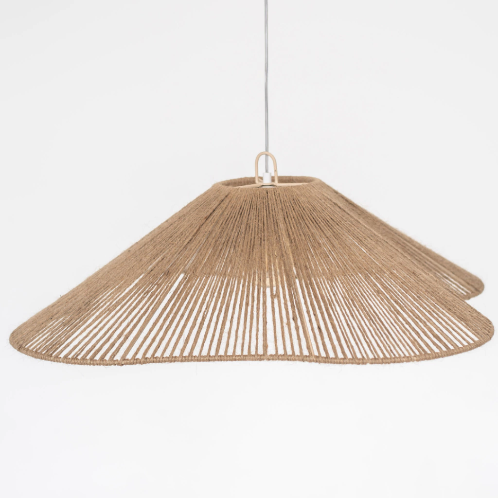 Lámpara Colgante Alina. Materiales disponibles: Polipropileno, Papel Kraft y Yute. Tres opciones de hilado que destacan en cualquier ambiente. Incluye un kit eléctrico de 1 metro en blanco o negro (cable, portalámparas y florón), para que puedas instalarla sin complicaciones. Fabricada a pedido con un tiempo de producción de 15 días hábiles.