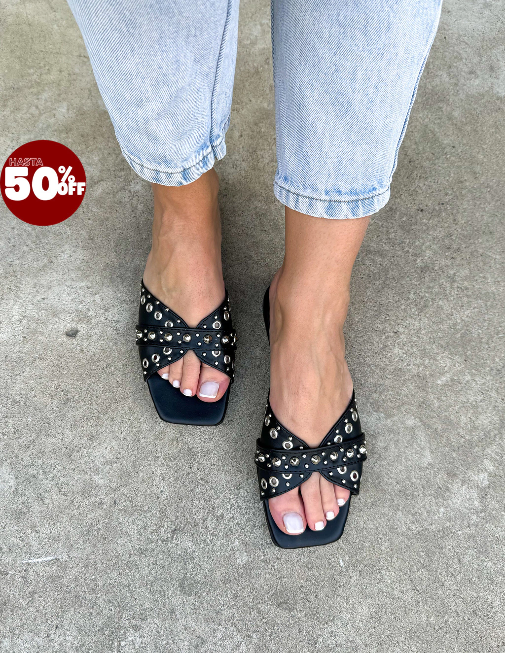 Las sandalias chatitas de cuero ecológico con tachas son una opción moderna y funcional para el día a día. Las tachas aportan un toque de estilo y actitud, mientras que el cuero ecológico ofrece una alternativa sostenible sin perder la elegancia. La base de goma antideslizante garantiza seguridad y estabilidad al caminar, lo que las hace ideales para cualquier superficie. Estas sandalias combinan perfectamente estilo, comodidad y practicidad, siendo una excelente elección para quienes buscan un calzado versátil y con carácter.• Material: Cuero Sintético• Altura del taco: 1 cm• Horma: Normal finita chica (se recomienda seleccionar tu talle habitual)Tabla de Medidas:• Talle 35: 23 cm• Talle 36: 23,5 cm• Talle 37: 24 cm• Talle 38: 25 cm• Talle 39: 25,5 cm• Talle 40: 26 cmNota Importante:Para la confección de los zapatos se utilizan cueros y cueros sintéticos seleccionados de alta calidad. Al ser únicos y naturales, pueden presentar alteraciones en el tono, marcas, arrugas o pliegues. Dichas características no se consideran como imperfecciones, ya que son manifestaciones propias del material.Para obtener el mejor ajuste, se recomienda consultar la tabla de medidas y considerar las recomendaciones sobre la horma del zapato.