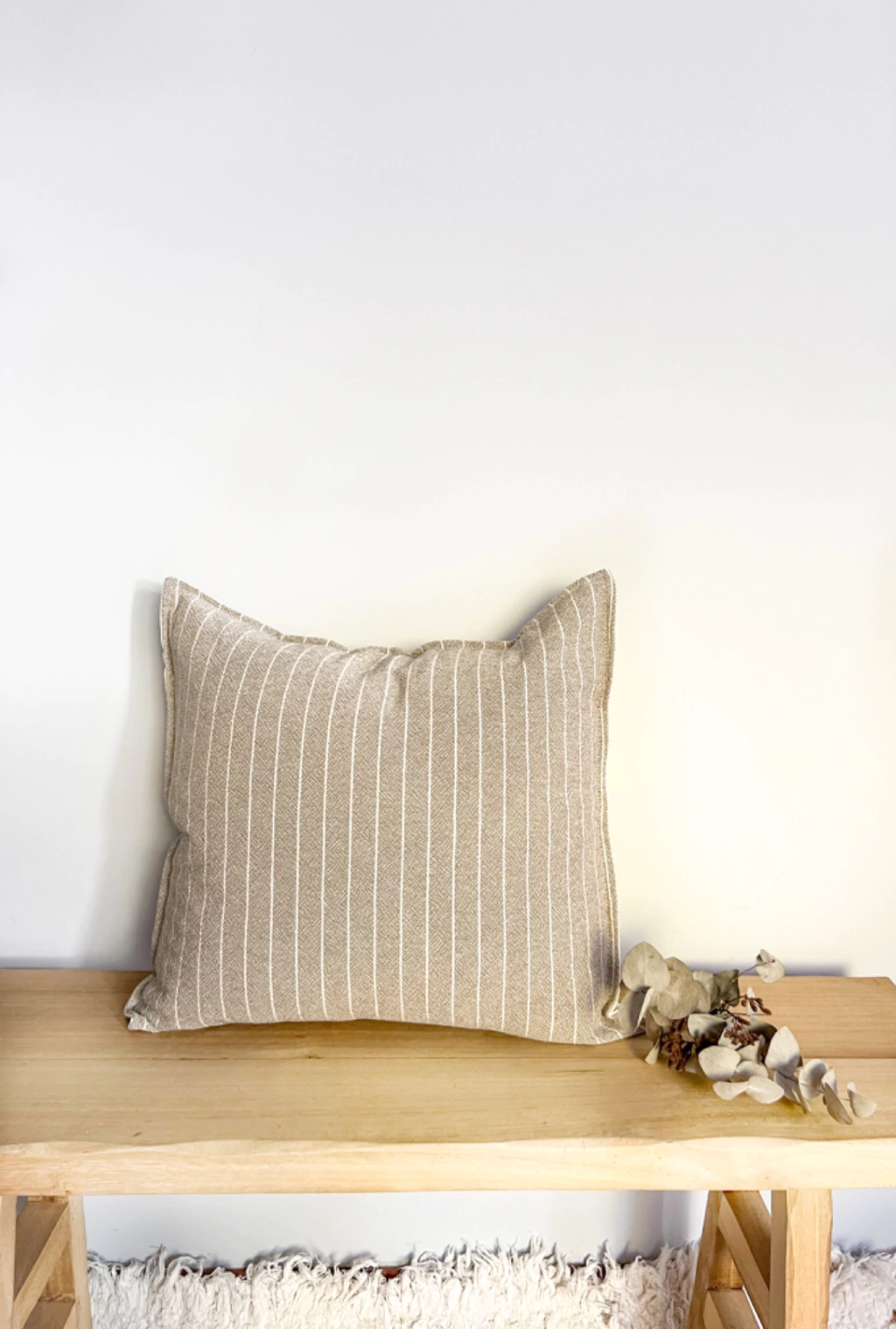 Almohadón 50x50 confeccionado en tusor tejido color tostado con rayas naturales. Relleno de vellón siliconado, súper cómodo y suave.Combínalo con almohadones Cali o Holbox. Quedan geniales juntos!En caso de no tener stock el tiempo de demora aproximadamente es de 10 días.Podes seleccionar con o sin relleno