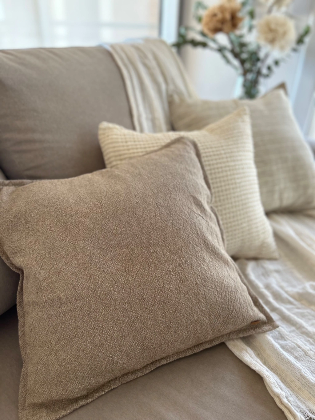 Almohadones de tela tusor con doble hilado. Más grueso y rugoso. Color tierra. La funda es desmontable (apta lavado en lavarropas). El relleno es de vellon siliconado.