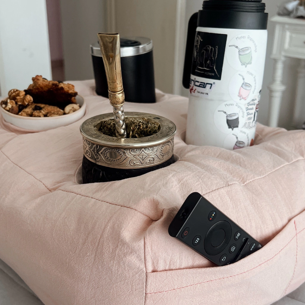 Almohadon matero con 4 compartimientos para mate, termo, yerba, algo de comer o el control remoto. Esta especialmente creado para combinar con tu mate personalizado y tenerlo en la cama o sillon todo el dia.No incluye mate.