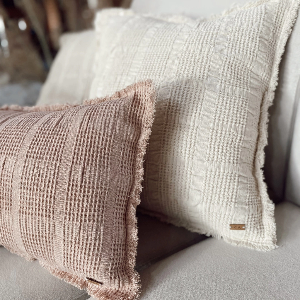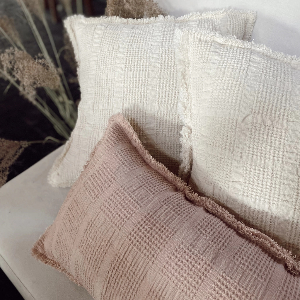 Almohadón tela waffle. Funda desmontable (apta lavado en lavarropas) + relleno de vellón siliconado.