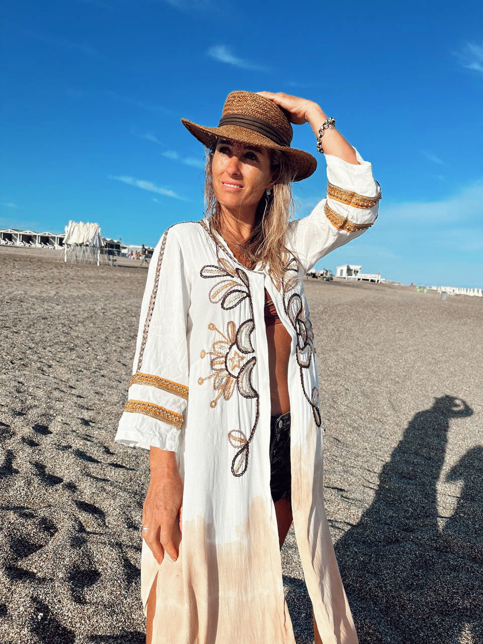 DETALLES DEL PRODUCTOKimono largo teñido en batik. Bordado a mano en en frente en dorado con aplicación de guarda Hindu.CUIDADOSLavar a mano con jabón neutro y agua fria ( Temperatura máx40°c) | Lavar por separado | No escurrir ni dejar en remojo | No secar en máquina-secado en línea y a la sombra.