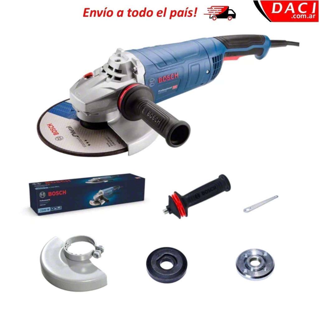 AMOLADORA ANGULAR GWS 25-230 PROFESSIONAL BOSCHLa amoladora de 2500 W más ligera del mercado y con la mejor relación potencia-peso.Mayor ergonomía y optimización para el usuario.Alto rendimiento de arranque de material: el nuevo motor Bosch ofrece el mejor rendimiento de su categoría. Con escobillas de carbono más duraderas y menor deceleración en los trabajos pesados.Flujo de aire optimizado: sistema de flujo de aire patentado que aumenta en un 20 % la refrigeración del motor, lo que aumenta el rendimiento y la vida útil.Menos fatiga para el usuario: la reducción de las vibraciones permite sobrellevar más horas de trabajo.Con un agarre más cómodo que permite controlar mejor la herramienta.Mayor resistencia a la abrasión: mejor resistencia a la abrasión causada por restos de hormigón y hierro que atraviesan el motor de la máquina.La placa de características grabada al láser permite una mayor duración y facilita las reparaciones.Interruptor de paleta (opcional): más versiones con interruptor con función de hombre muerto, para una mayor seguridad del usuario.De fácil reparación: la mayoría de las piezas de recambio son intercambiables entre la herramienta actual y la nueva familia de próximo lanzamientoDatos adicionalesPotencia absorbida2.500 WVelocidad de giro en vacío6.500 rpmDiámetro de disco230 mmCabezal de pulido, diámetro140 mmPeso5,9 kgØ del plato lijador (de goma)180 mm