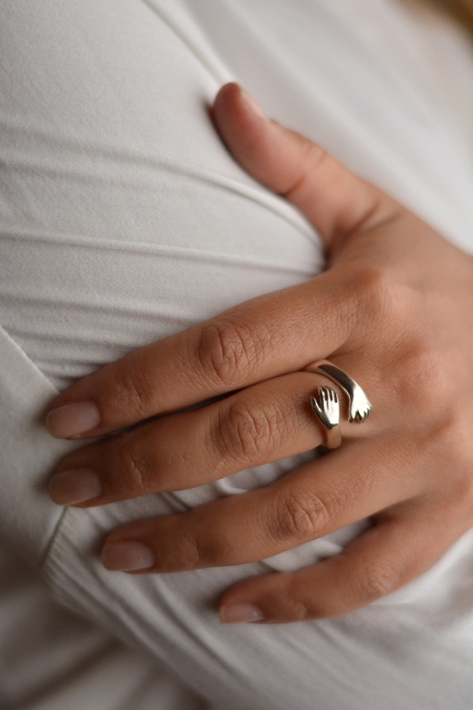 Anillo de plata 925 hecho a mano con diseño de abrazo. Realizado totalmente a mano bajo la técnica de modelado en cera y cincelado. Una pieza muy delicada y original que no pasa desapercibida. El cincelado es una técnica milenaria que se realiza a golpe de martillo y cincel en un trabajo laborioso de paciencia y delicadeza.