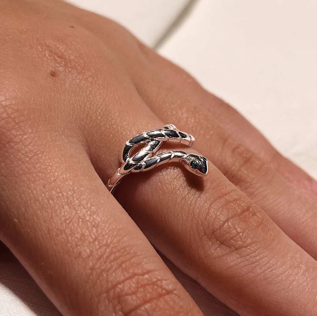 Anillo con forma de cobra y ojos en micropavé verde.Material: plata 925.