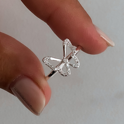 Anillo fino con mariposa calada terminada en mini circonias de plata 925.
