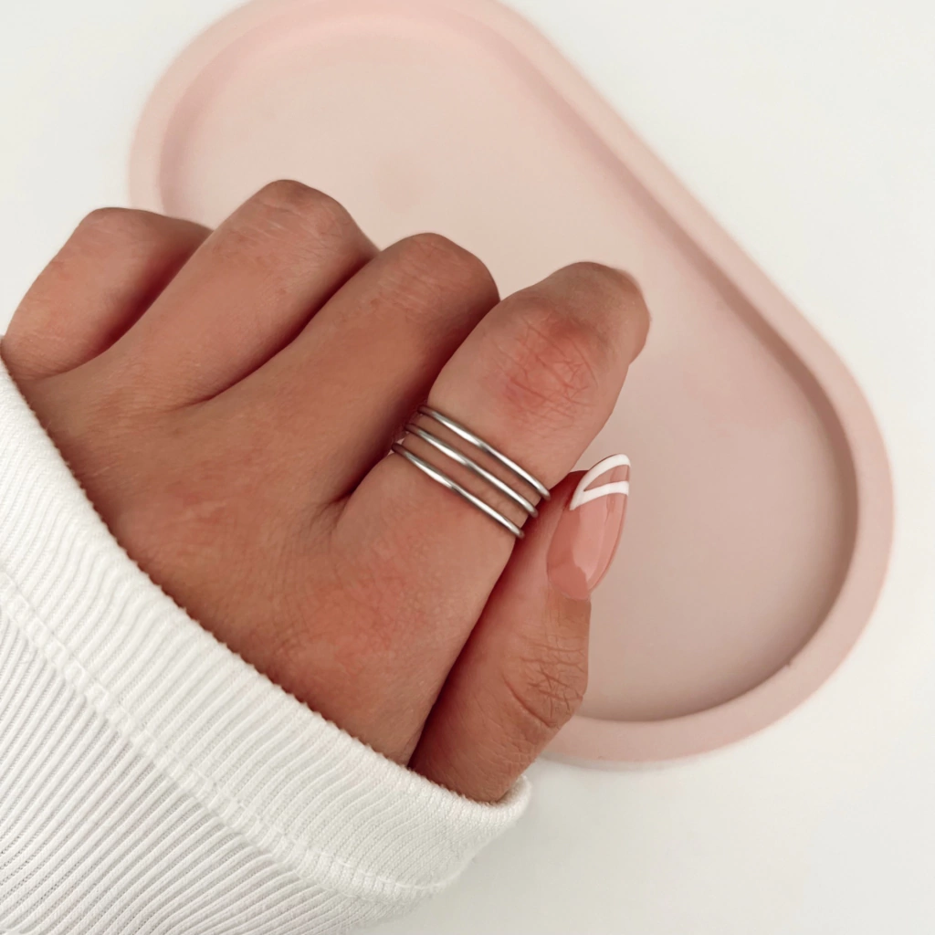 Anillo TripleEste modelo es un anillo de tres líneas finas de acero quirúrgico clásico y atemporal para uso diario. Para saber tu talle es muy importante que puedasmedir el diámetro interno de un anillo que ya tengas para aproximarte al talle que buscas. Tené en cuenta que vas a tener que medir la parte más ancha del anillo(como indica la segunda foto del producto)para asegurarte que pase por los nudillos sin problemas. Ahora resta comparar tu resultado con las medidas que te dejamos a continuación. Recordá que no todos los dedos miden lo mismo. De igual forma ocurre al cambiar de mano 🖐🏽.Medidas aproximadas por talle en milímetrosTalle 10: 15.5 mm | Talle 1a1: 15.9 mm | Talle 12: 16.1 mmTalle 13: 16.8 mm | Talle 14: 17 mm | Talle 15: 17.2 mmTalle 16: 17.6 mm|Talle 17: 18 mm|Talle 18: 18.4 mmTalle 19: 18.8 mm | Talle 20: 19 mmDetalles del producto- Material: Acero Quirúrgico- Talles sujetos a stock disponible💬 Cualquier duda escribinos porWhatsApplunes a viernes de 9 a 18 hs.