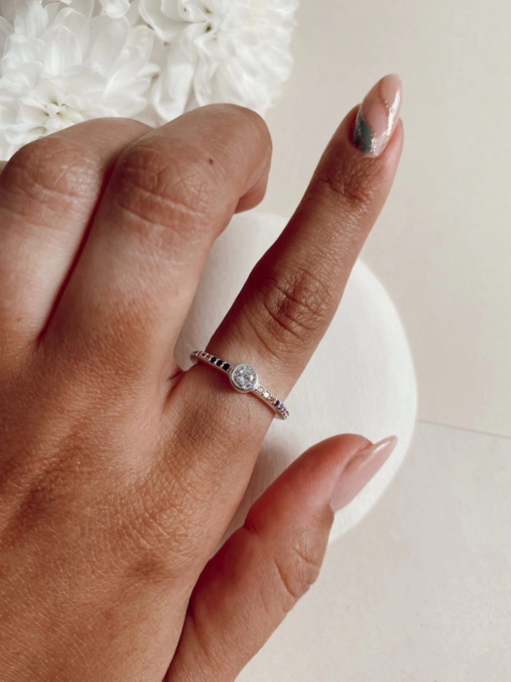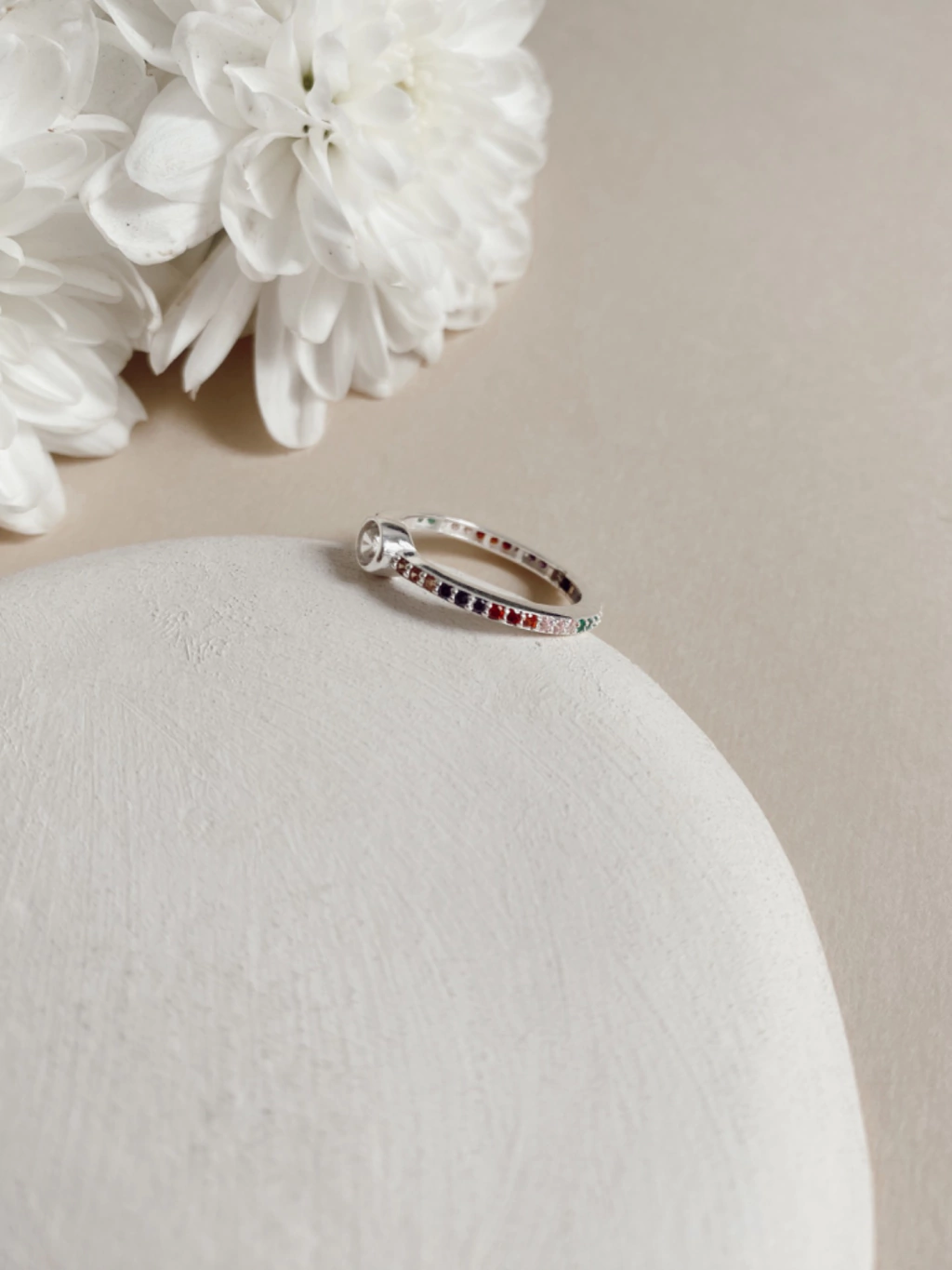 Anillo de plata 925 con cubic de colores en toda su circunferencia con un mini Cubic en el centro.