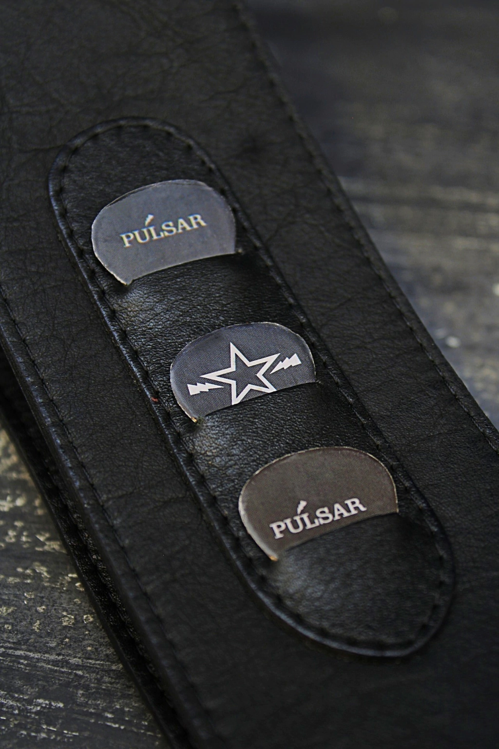 Reves forrado en suave cuero napado, con porta púas. 7cm de ancho. Regulable desde 1 metro a 1,40.