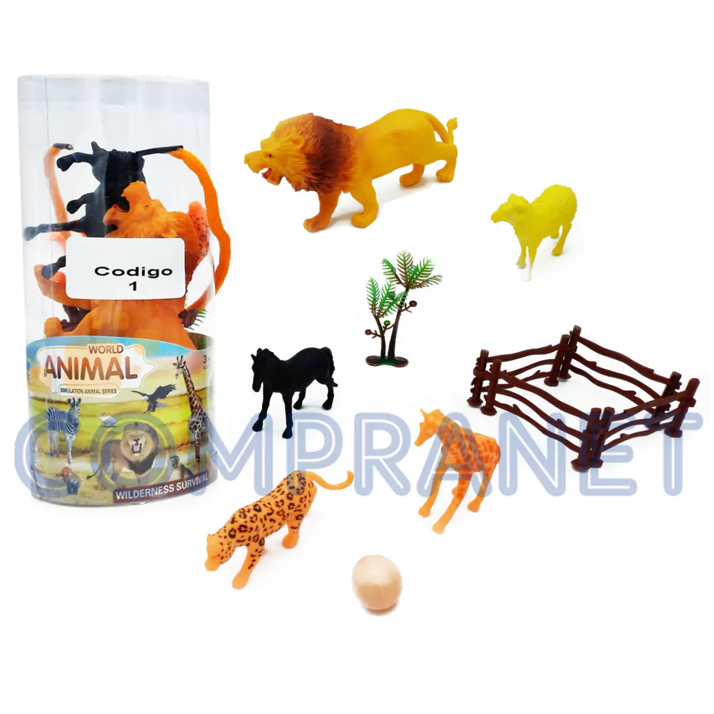 Animales de la Selva y de la Granja, en tubo, por 11 piezas. Tubo plástico con manija para transportar con facilidad. Incluye 11 piezas cada tubo. Cuenta con varios accesorios para armar el escenario perfecto y jugar durante horas.Incluye animales como: tigre, león, chancho, caballo, camello, jirafa, palmeras y cercos, etc.Disponible en 4 modelos con animales variados.Elegí el que más te guste!Para niños mayores de 3 años.Permite el desarrollo de la interacción entre los niños, estimula la imaginación, la comunicación, desarrolla la curiosidad en los niños, la estimulación y la coordinación.En Tubo plástico. No utiliza pilasMedidas del Tubo: 8 cm (ancho) x 18 cm (alto)Medida aproximada de los animales: 14 cm (largo) x 6 cm (alto)
