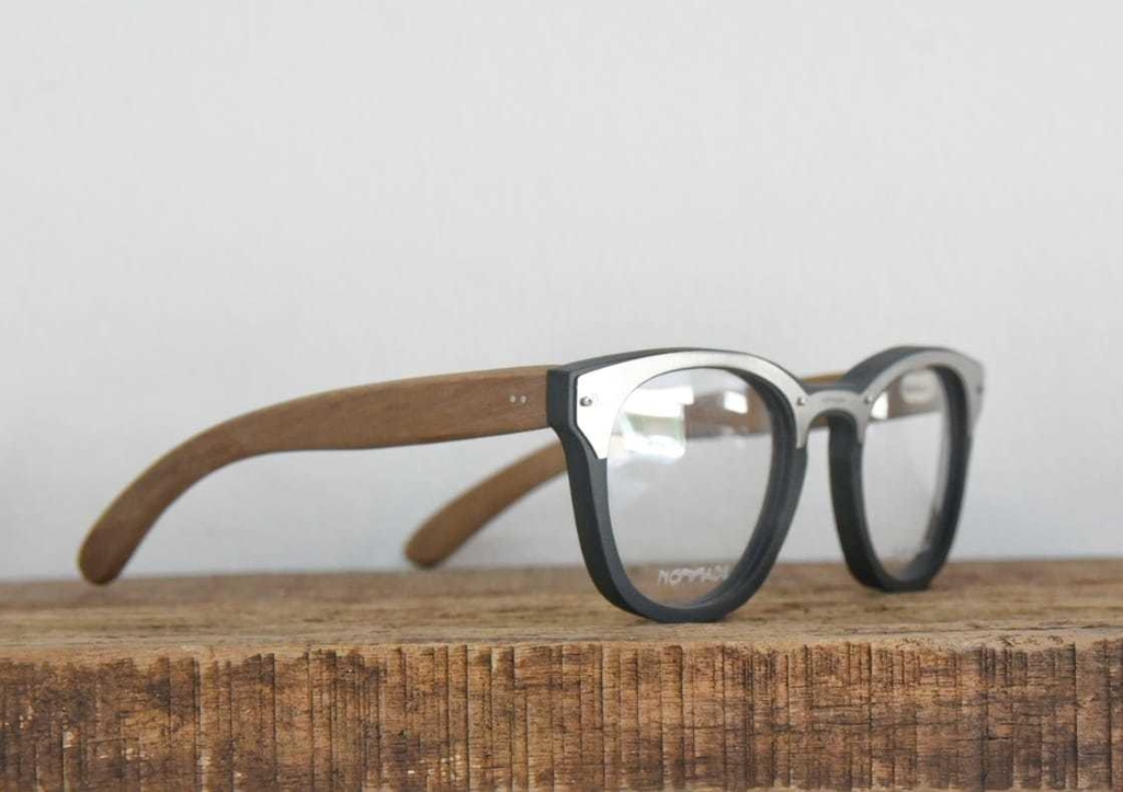 - Anteojos de madera (patillas), acetato (frente) y acero inoxidable (medio aro del frente) para colocar lentes de aumento