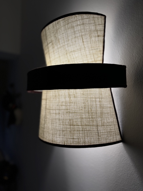 Medidas: 35 cm de alto por 35 cm de diámetro.Entelado en arpillera clara, con pana verde musgo y terminación en terciopelo.100% handmade.Lámparas Artesanales, perfectamente imperfectas Lampes.
