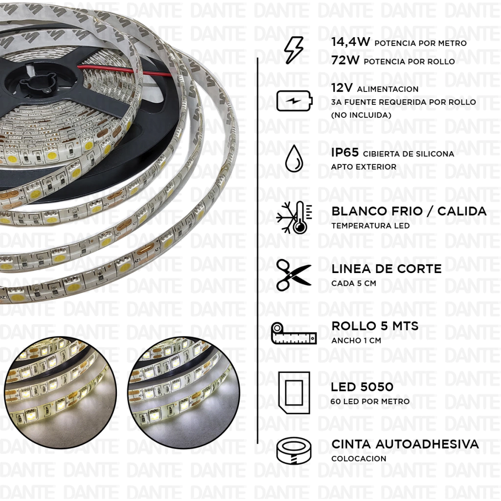DescripciónTIRA LED 5050 – FRIO o CALIDO - APTA EXTERIOO IP65POTENCIA: 72W POR ROLLO // 14,4 POTENCIA POR METROMETROS POR ROLLO: 5METROS / ancho 1 CMLED 5050ALIMENTACION: 12V ** 3a fuente requerida por rollo ** NO INCLUIDAAPTO EXTERIOR IP65 - CUBIERTA SILICONATEMPERATURA: BLANCO FRIO / BLANCO CALIDO ** según variante activa **LINEA DE CORTE: CADA 5 CMCOLOCACION: CINTA AUTOADHESIVA (recomendamos fortalecer las puntas con otro pegamento para su mayor duración)** EL PECIO NO INCLOUYE FUENTE**----- POR FAVOR ELEGIR VARIANTE DE LUZ ANTES DE REALIZAR LA COMPRA DESDE LA MISMA PUBLICACIONcod.: ACCM1001 // ACCM1002