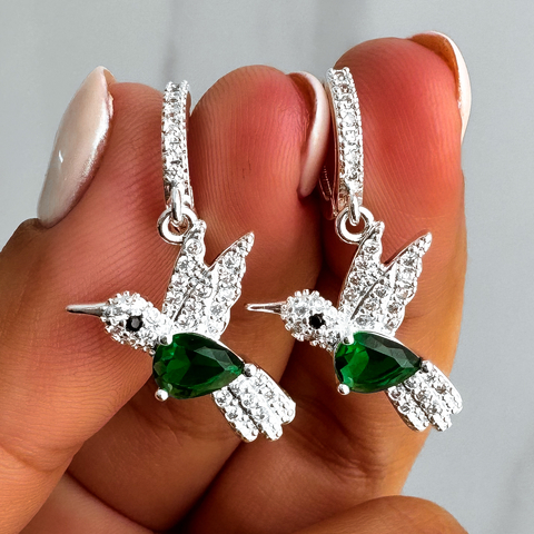 Par de argollas broquel con dije colibrí color verde, terminadas en mini brillantes.Medidas aprox.:- Argolla: 1.3cmd.- Dije: 1.5cm de ancho - 1.8cm de alto.- Largo total: 2cm.Material: Acero blanco.