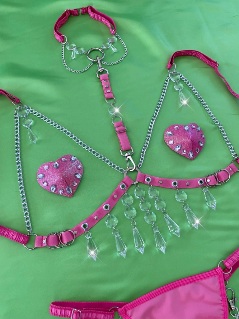 Arnes con feccionado con elasticos regulables, detalles de ojales, tachas, gemas colgantes, cadenas, mosquetones para desmontar centro.
