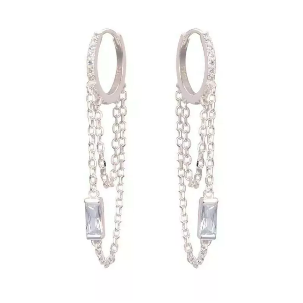 PAR DE AROS HUGGIES CADENA COLGANTES Y DETALLE CRYSTAL EN PLATA 925
