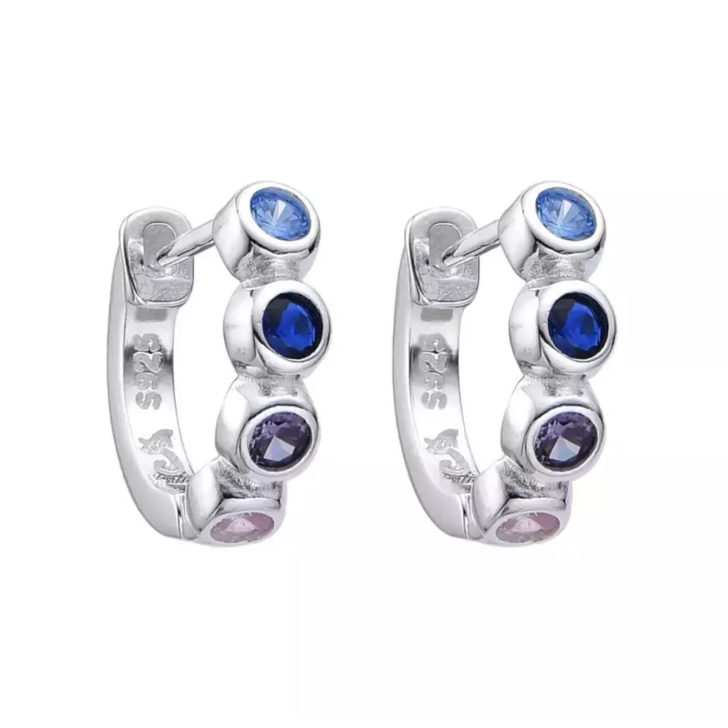 PAR DE AROS HUGGIES STONES CON ZIRCONIAS COLOR AZUL, CELESTE, VIOLETA Y ROSA EN PLATA 925