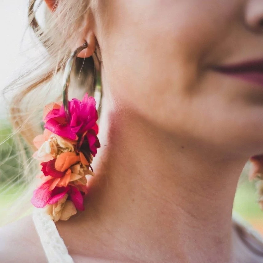 DescripciónAros de flores naturales preservadas y secas. Ideal para usar todos los días y en eventos especiales. La base de los aros es de acero quirúrgico, y de 4 cm de diámetro. El largo de las flores es de 6 cm aprox.Información del productoLas flores que usamos son preservadas y secas. La gran ventaja de este tipo de accesorio es que dura toda la vida si se lo cuida bien.Colores, flores y combinacionesLas imágenes son de referencia, vos podés elegir los colores y combinaciones que quieras.Una vez que hayas hecho la compra, contactate con nosotros llamando o mandando mensaje de whatsapp al 11.5988.1141. Por este medio definiremos los colores y flores para personalizar tu accesorio!EnvíoUna vez que esté hecho el accesorio personalizado vamos a enviarte imágenes para que lo veas y nos des el ok. A partir de ahí coordinamos el envío. Tené en cuenta que a lo largo del año hay temporadas altas y bajas de eventos! Según la época puede haber mayor o menor demora en la producción! Siempre hacé tu pedido con la mayor anticipación que puedas y cualquier consulta que tengas no dudes en escribirnos.Retiro presencialSe coordina previamente. El Showroom se encuentra en Nuñez, CABA.
