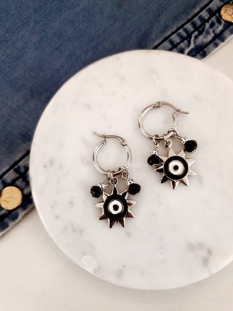 Detalles de productoAros argolla de acero quirurgico y dijes de metal y cristalesDimensionesMedida: 1,50 cm x 1,50 cm cm las medidas son aproximadas.ComposiciónAcero quirurgico plateado, metal y cristal
