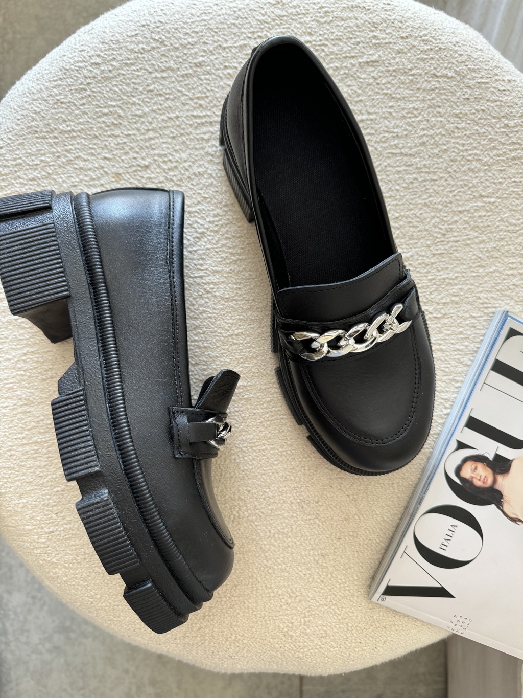 Taco: 4,5 cm.Plataforma: 2 cm.Material: Ecocuero de alta calidad.Diseño: Detalle de cadena plateada.