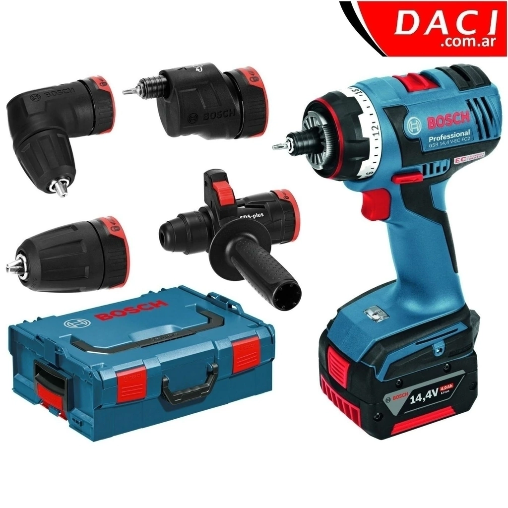 ATORNILLADOR GSR 18 V-EC FC2 1/4 y mandril 90° SDS PLUS 4ah BOSCHDatos técnicosDatos adicionalesTensión de la batería 18 VTorque (suave/duro/máx.) 31/60/- NmVelocidad de giro en vacío (1.ª velocidad/2.ª velocidad) 0 – 600 / 0 – 1,900 rpmPeso sin batería 0.9 kgTipo de batería LitioCapacidad mín./máx. de sujeción del portabrocas 1.5 / 13 mmAjustes del par de giro 20+1Ø de los tornillosØ máx. de los tornillos 10 mmØ de perforaciónØ de perforación máx. en madera 38 mmØ de perforación máx. en acero 13 mmNiveles de vibración totales (Atornillar)Nivel de vibraciones generadas ah 0 m/s²Incertidumbre K 1.5 m/s²VentajasSistema FlexiClick de Bosch: flexible y versátil para cualquier tarea en la categoría de 18 VFlexibilidad total: con varios adaptadores ajustables, el sistema FlexiClick de Bosch proporciona la solución óptima para cualquier situación de trabajoManejo sencillo: los accesorios FlexiClick de Bosch se pueden colocar en 16 posiciones distintas (360°) sin necesidad de retirarlos del atornillador a bateríaVersátil: el exclusivo adaptador de martillo perforador convierte el atornillador/taladro en todo un martillo perforadorQué incluye el paqueteGSR 18V-60 FC ProfessionalNúmero de pedido: 0 601 9G7 1G02 baterías GBA 18V 2.0Ah1 600 Z00 036Cargador GAL 18V-20 ProfessionalL-BOXX 1361 600 A01 2G0Adaptador de portabrocas de metal GFA 18-M Professional1 600 A01 3P6Adaptador angular GFA 18-W Professional1 600 A01 3P7Adaptador para martillo, incl. empuñadura adicional GHA FC21 600 A00 3NF